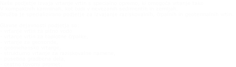 Naše podjetje izvaja vrtanje vrtin s specialno opremo, ki omogoča vrtanje tako v kompaktnih kamninah kakor tudi v nevezanih sedimentih in zemljinah. Družba je specializirano podjetje za izvajanje raziskovalnih, črpalnih in geotermalnih vrtin.